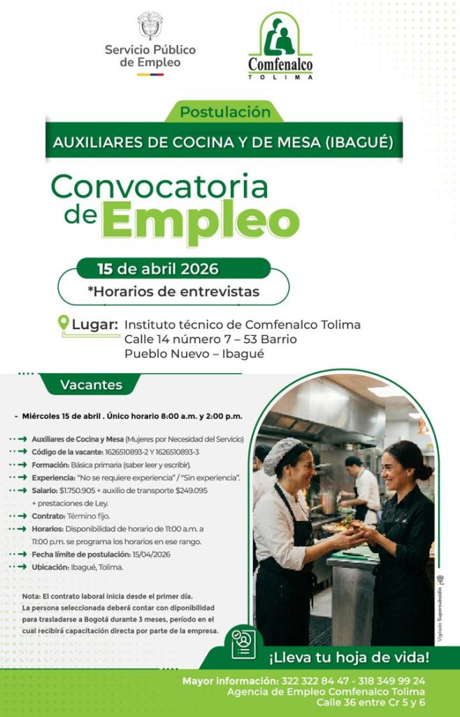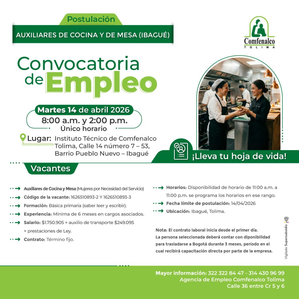 La Agencia de Empleo de Comfenalco Tolima ha lanzado una importante convocatoria laboral dirigida a mujeres interesadas en desempeñarse como auxiliares de cocina y de mesa en la ciudad de Ibagué.