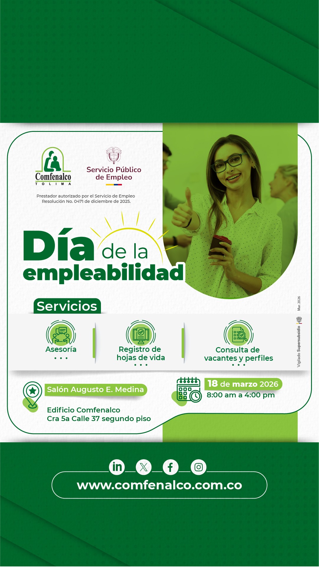 Vinculado a la red de prestadores del Servicio Público de Empleo Autorizado por la Unidad Administrativa Especial del Servicio Público de Empleo Según Resolución No. 0471 de diciembre 19 de 2025.