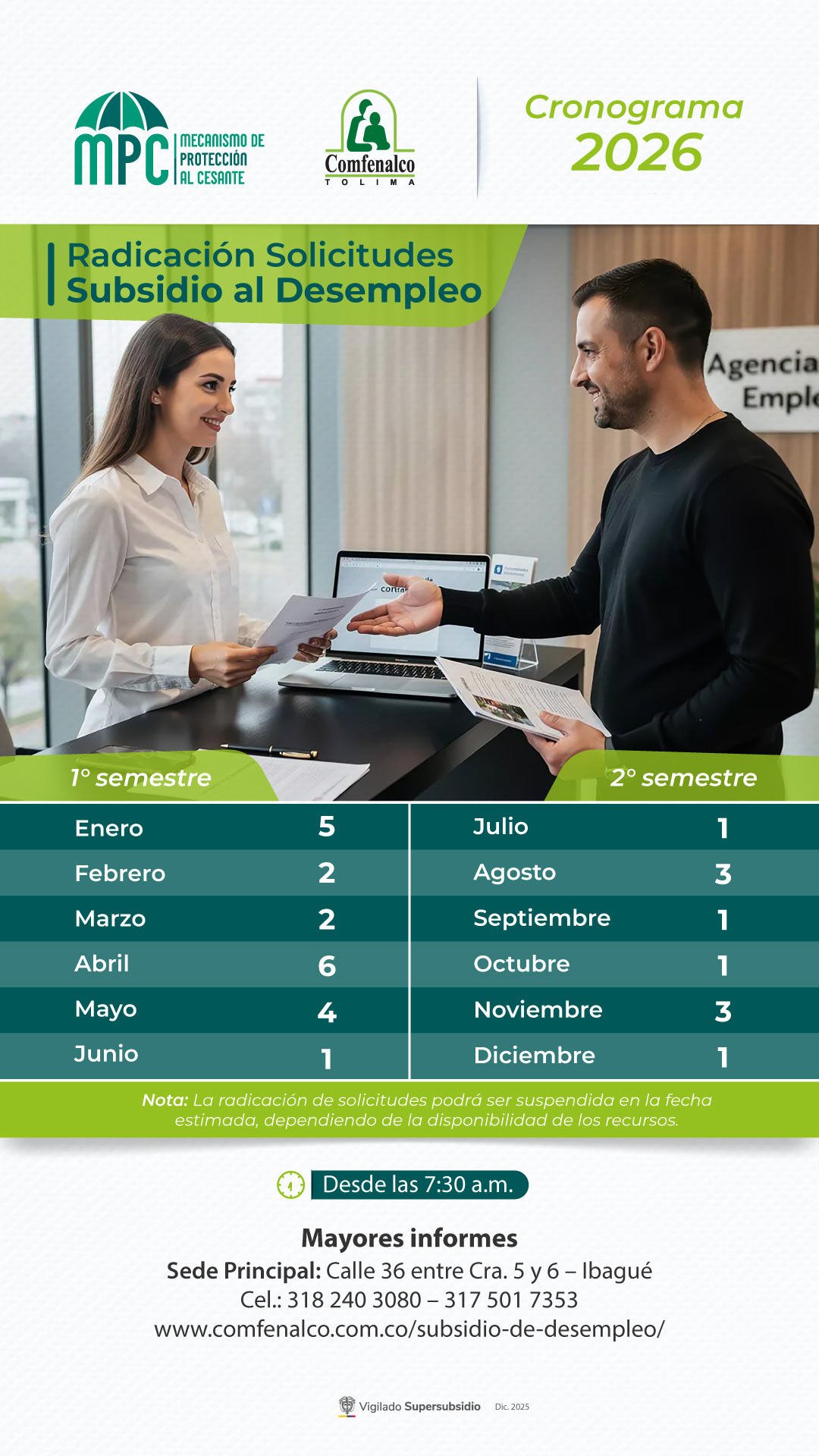 Horario atención: lunes a jueves de 7:30 a.m. a 12:00 m. y de 2:00 p.m. a 4:30 p.m. y viernes de 7:30 a.m. a 12:00 m. y de 2:00 p.m. a 4:00 p.m.